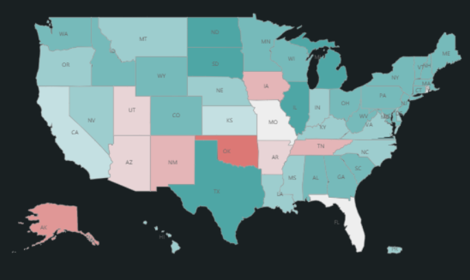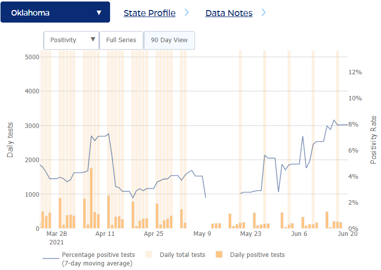 So far, most states positivity rates are below the 3% level scientists have used to indicate the need for restrictions. Missouri and Oklahoma for whatever reason are outliers, with both approaching a 10% positivity rate.