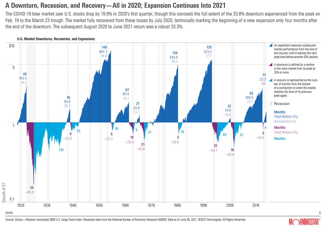I don’t believe we’ve seen a permanent shift. Recessions and bear markets will happen and we won’t see the amount of money and effort thrown at them to prevent some severe damage. I like to look at this chart from Morningstar to provide prospective. Most of the time the market goes up as you can see from the dark blue areas. However, there are times in between where the market can lose a lot of money and spend 1-5 years “underwater”. If you are young and working and not living off your investments, those are frustrating years, but nothing dire. If you are older, retired, or nearly retired or needing the investments for something in the next 5-10 years those periods in the lower half of the chart can be devastating.