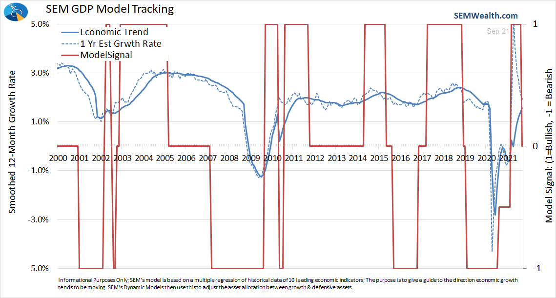 Turning back to the economy, as expected, SEM's quantitative economic model has moved from "bullish" to "transition" based on the most recent monthly economic data. This doesn't mean we will head towards a recession, but instead that the pace of expected economic growth has slowed enough it could lead to problems for the stock market. You can see how rapidly our model's expected growth rate has slowed the past few months. It is now running at a 1.85% annual pace, which is far below the 3% "normal" rate. It is also nearly back to the level it was BEFORE COVID, which wasn't that great.