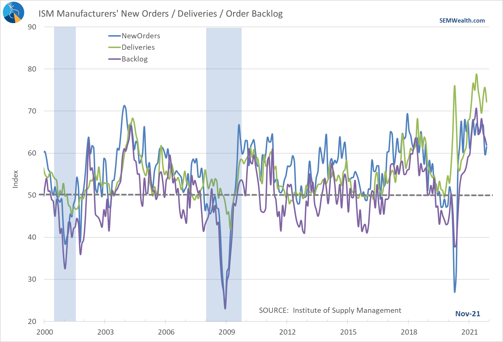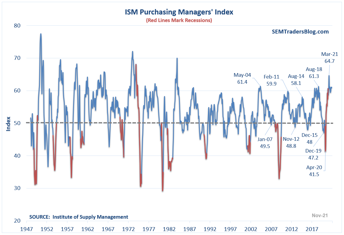 These indicators are also simple to understand – over 50 indicates "expansion", under 50 indicates a "contraction". The Manufacturers' Index is still well above 60 and improved again in November.