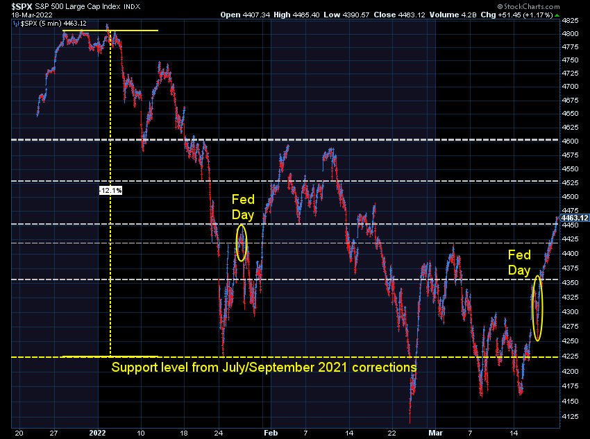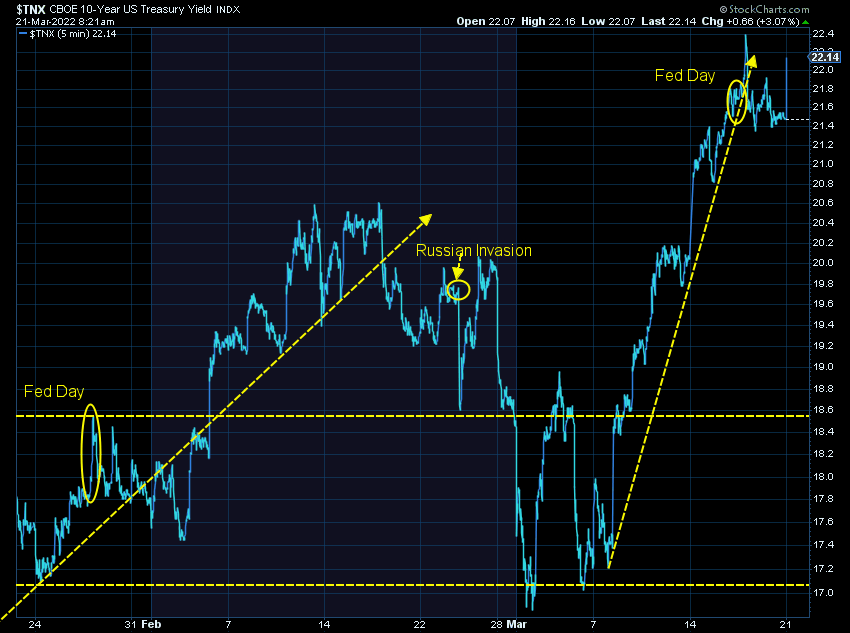 I don't have a lot to say/add to the talking points above. It is fascinating to look at where stocks are at versus bonds. Remember back in January when the Fed hinted they would be raising rates about 6 or 7 times in 2022? The stock market had already begun to sell-off the first week of January when several Federal Reserve members said the same thing. The selling continued after that January meeting. This week the Fed still said to expect 6 or 7 rate hikes, but apparently stock investors/traders/speculators took solace that the Fed Chair seemed to care more about the economy than inflation getting out of control.