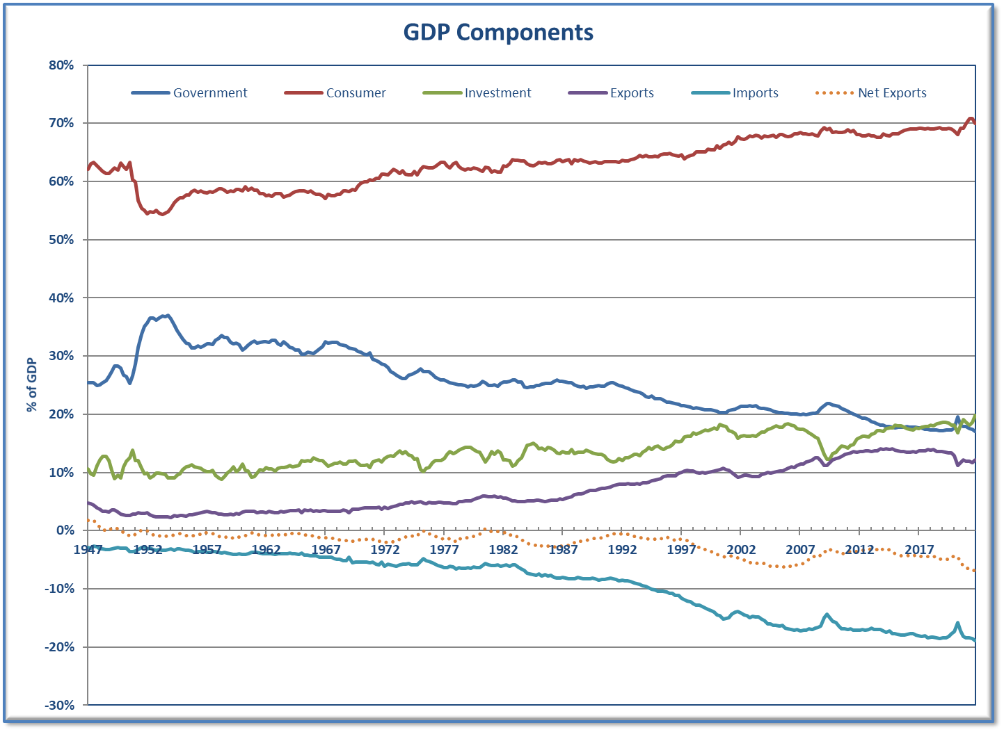 Both the gap between potential and actual GDP and the lack of improvement in productivity is directly related to our twin deficits (trade & budget). As we focused on maximizing corporate profits, we constantly found ways to offshore anything we could. When we break down GDP into the various components, we can see the drag our trade deficit has created (the dashed orange line is the difference between exports and imports – if we import more than we export, it reduces economic growth).