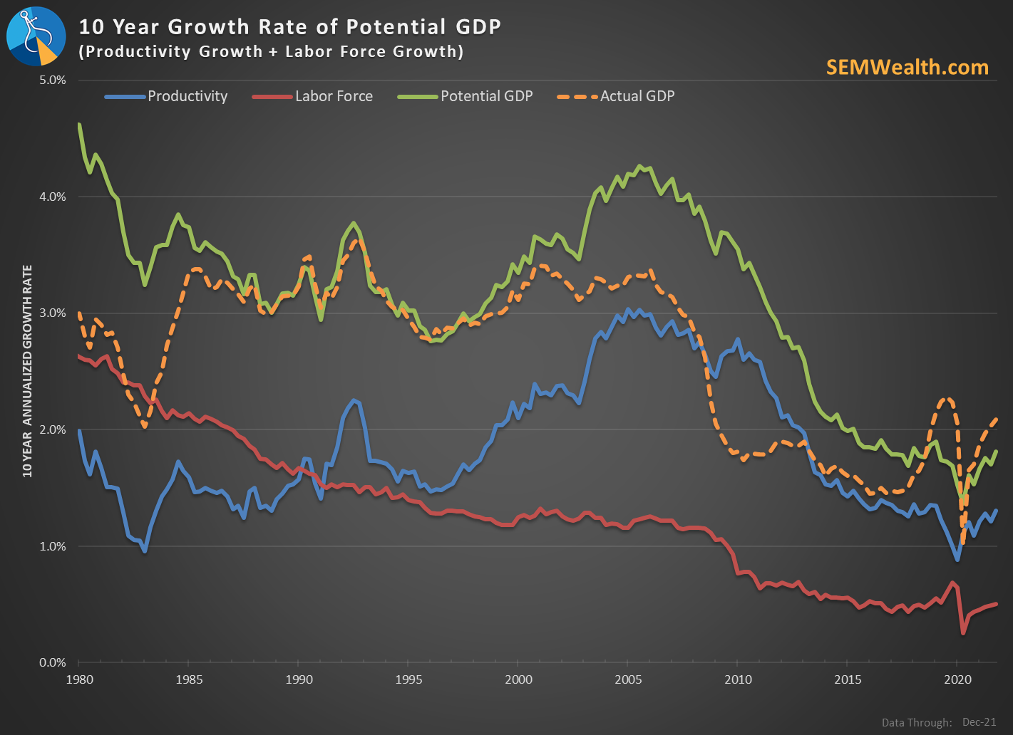 We can also see why GDP growth has been declining from a long-term average of 4% all the way down to the current 2.3% rate — the labor force is shrinking and productivity growth has been flat.
