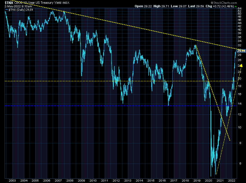 Long-term, we are reaching a critical level in rates. This chart shows the 40-year downtrend line in rates (or data agreement only allows me to show a 20-year chart.) We are getting precariously close to violating that trend line. We are also getting close to the 2019 peak in rates around 3.25%.