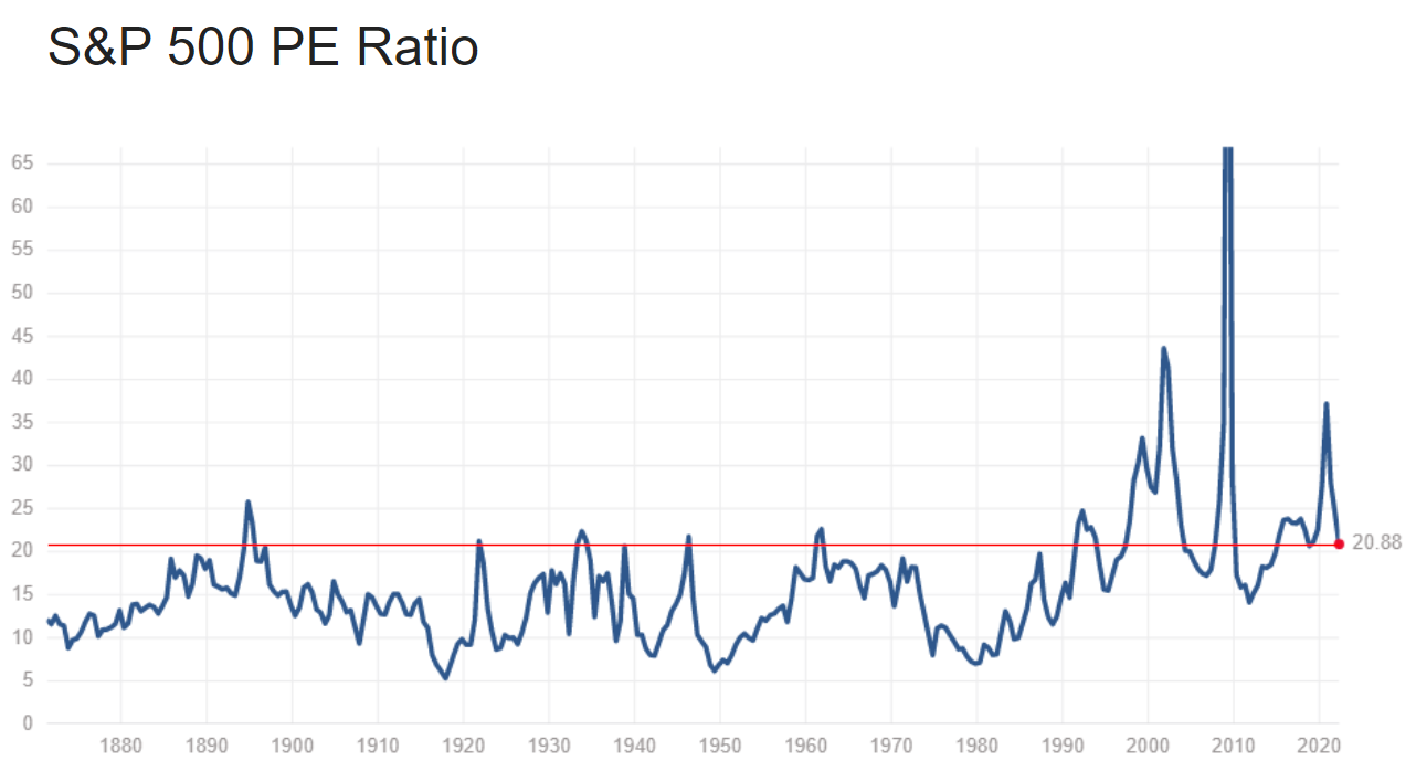 At current earnings estimates for 2022, a PE of 18 would put the S&P 500 at 4086, or just 1% lower from here. Using the 2009 low PE of 16, the S&P 500 would be at 3632 or 13% lower from here. (Note: in 2011 the PE actually went down to 13, which would be 2951 or 29% lower from here.)