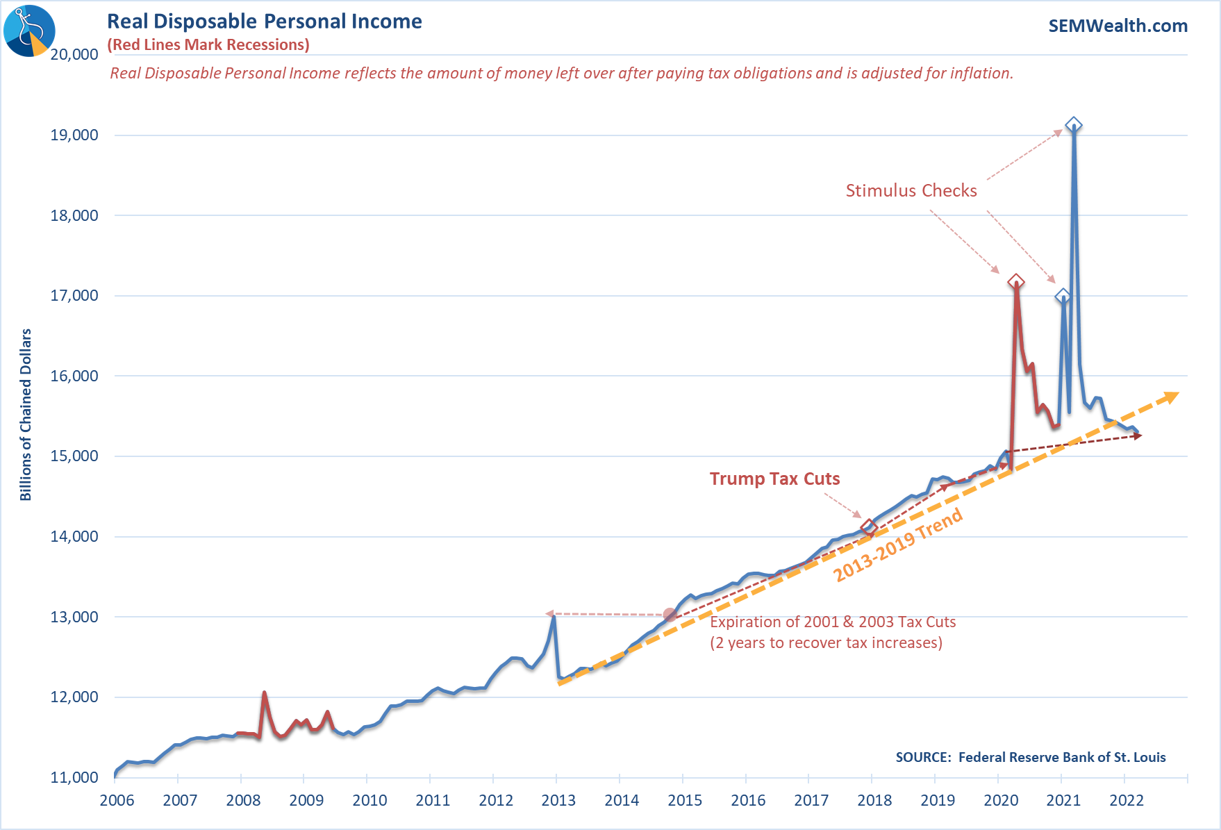 The problem now is those checks likely pushed the "normal" level of inflation higher which will make it more difficult to remove quickly. This will put a strain on households. The trend in personal income is actually below the 2013-2019 trend and is just slightly higher than where we were at before the pandemic. In other words, households have barely more money coming in than they did before the pandemic, but they are paying higher prices for pretty much everything.