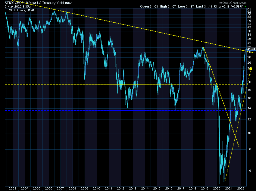 A bigger problem is we may be breaking the 40-year trend line in interest rates (or data agreement only allows us to show 20 years, but the dashed line goes back to the peak in rates in the mid-80s.