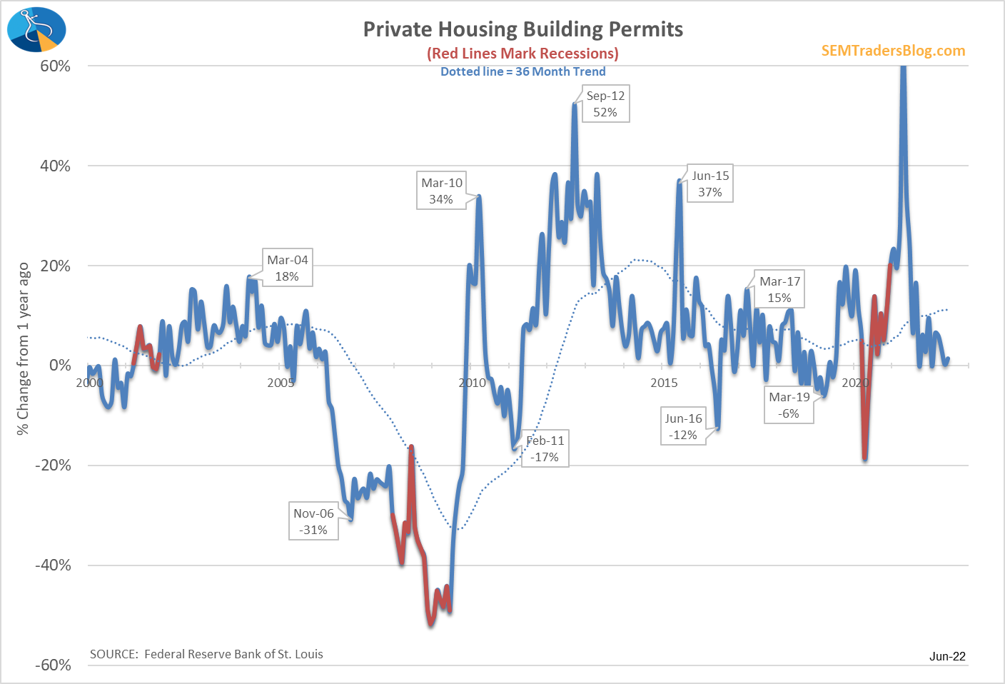 From an economic perspective two of my favorite leading indicators this week showed continued signs we are either already in a recession or very close. First was Building Permits, which have slowed significantly over the past 12 months.