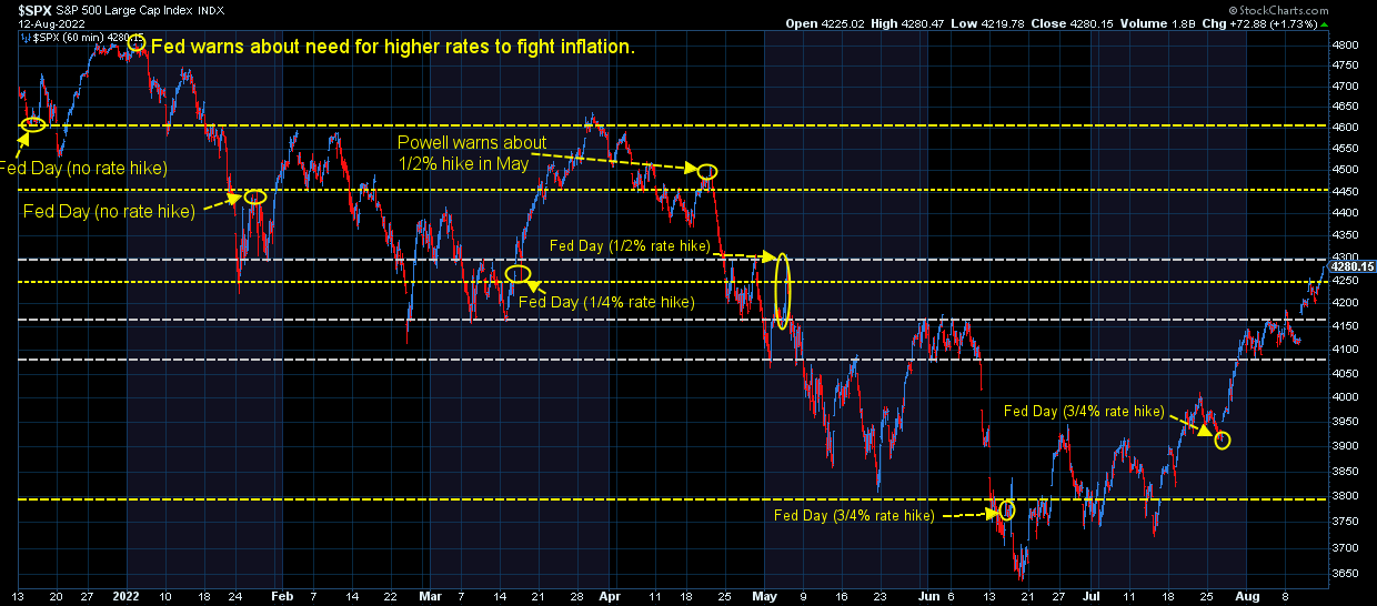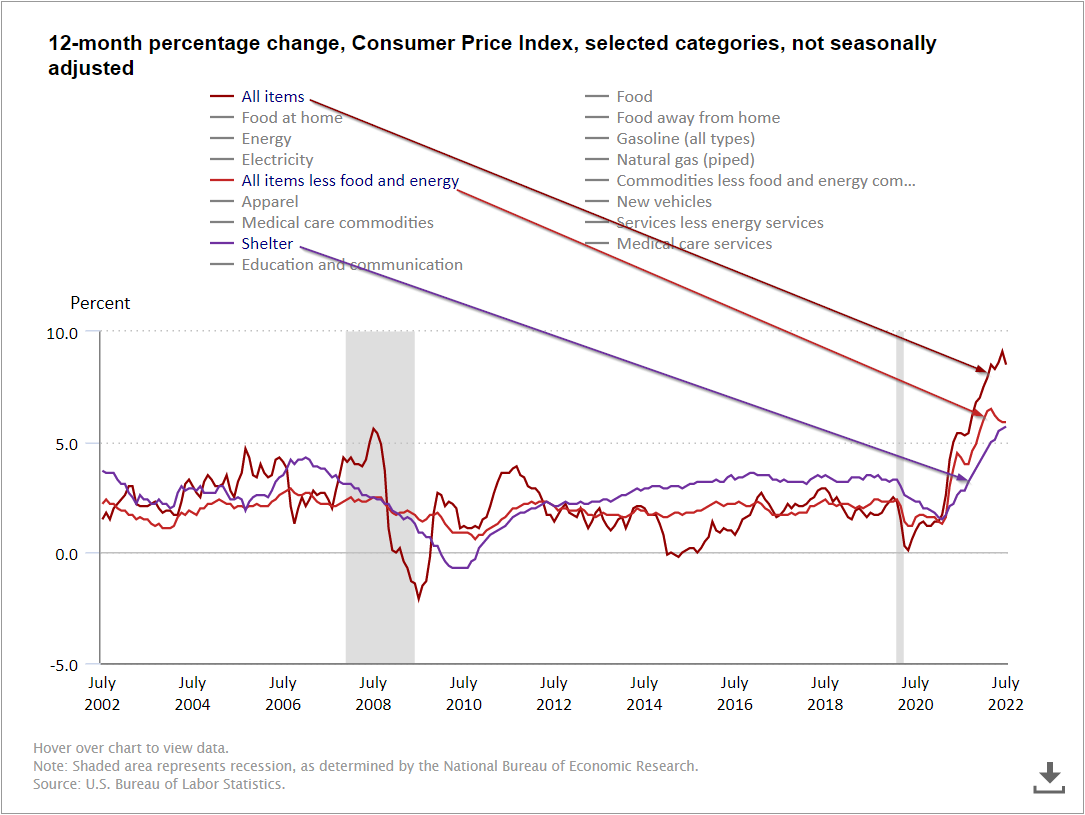 The source of the euphoria this week is after the "headline" CPI number showed a 0% month-to-month change. What this means is the basket of goods and services used to calculate CPI did not change overall in July. The "core" basket, which excludes food and energy rose by 0.3% for the month. For what it's worth if the "core" basket rose by 0.3% per month every month we'd have 3.7% inflation for the year. After experiencing 9% inflation, 3.7% sounds pretty good, except when you consider the damage that would do to our economy.