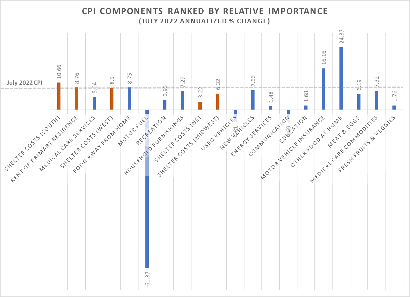 1.) The primary driver of CPI being "flat" was the huge drop in motor fuel. I think we've all enjoyed the nice drop in prices, but we have to realize fuel prices are significantly higher than they were a year ago and other than a sharp economic slowdown there aren't a lot of reasons fuel prices may not return to the $3 range from last Labor Day.