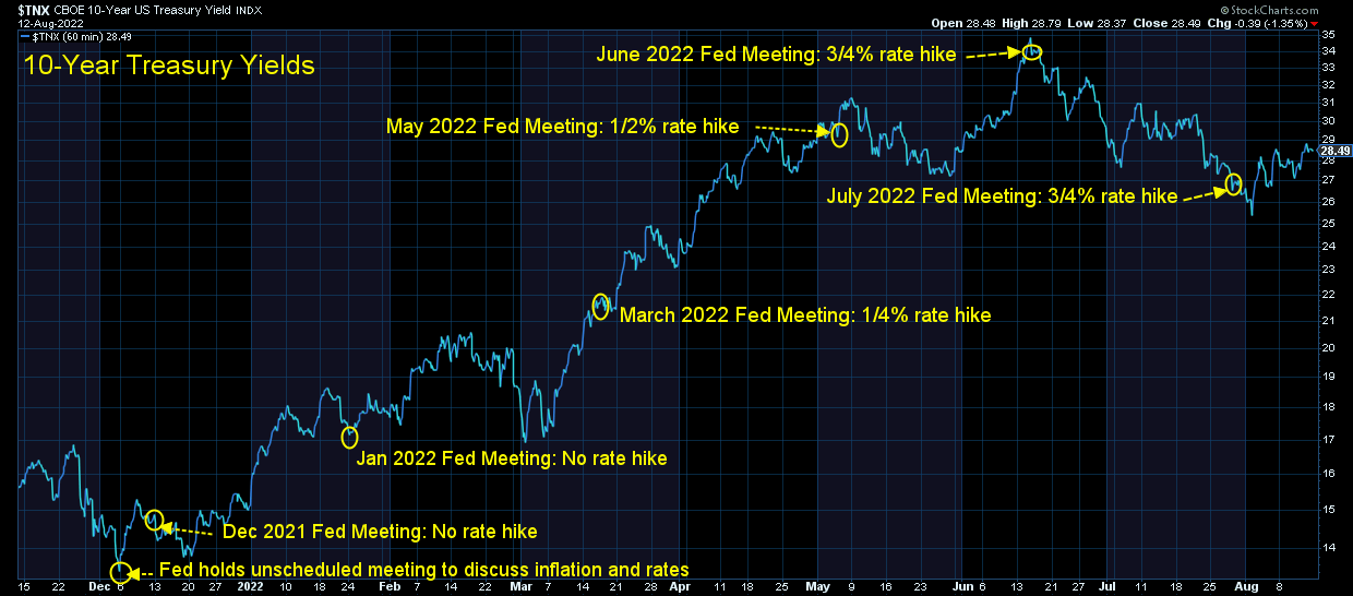 What I'm watching more closely is the reaction to the bond market. I said earlier in the year we could see a peak in yields if the Fed shows they are actually serious about fighting inflation. We certainly saw that after the first 3/4% rate hike, but over the past couple of weeks yields have drifted higher.