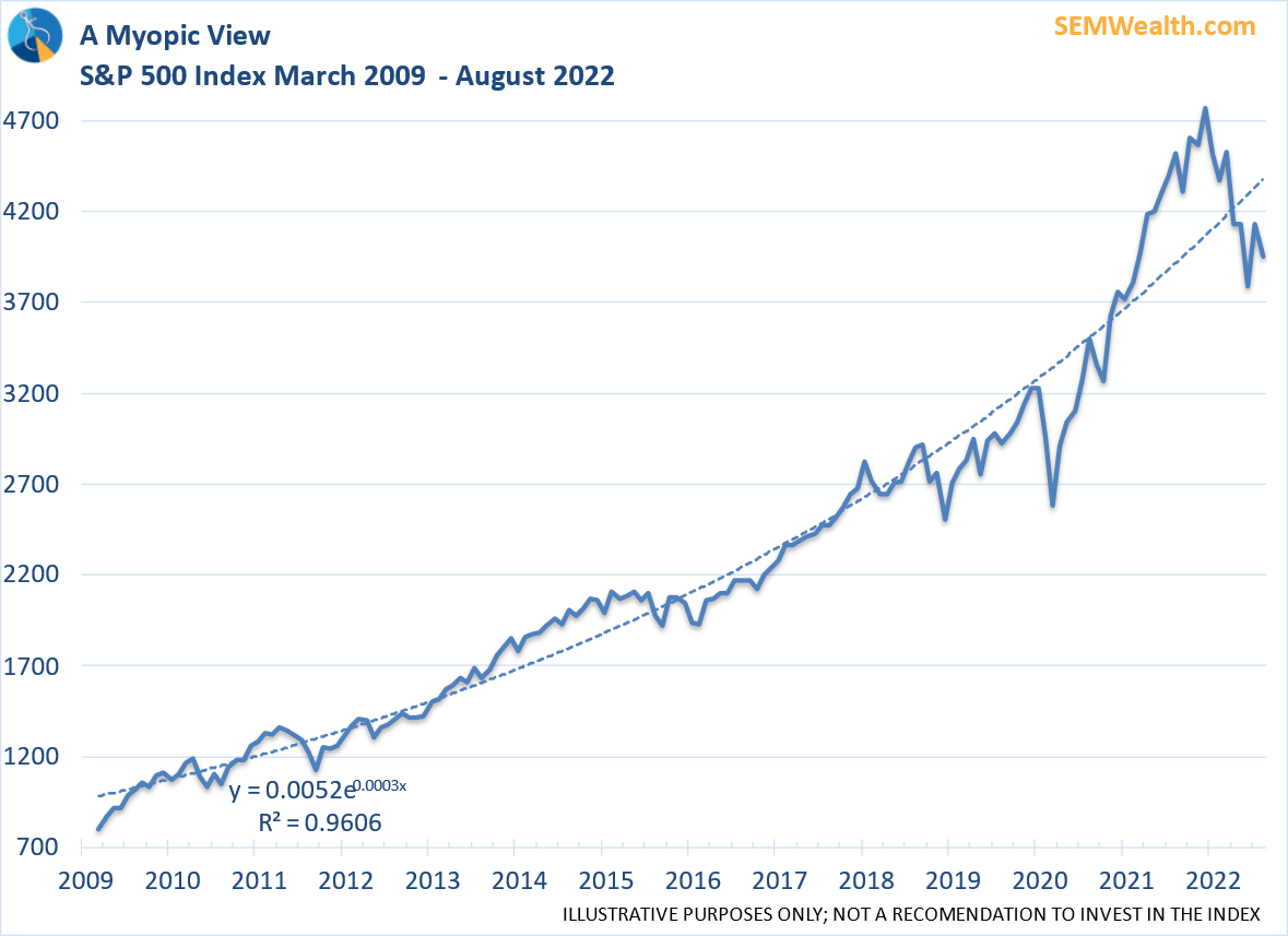 One reason this bear market could be much more painful is most investors either don't remember or have never experienced a TRUE bear market. I show this chart in pretty much every presentation. It shows the S&P 500 since the bottom of the market in 2009. At the time the market bottomed, most people forget that investor sentiment and advisors allocations to stocks were at all-time lows. In other words, pretty much everybody HATED the idea of owning stocks.