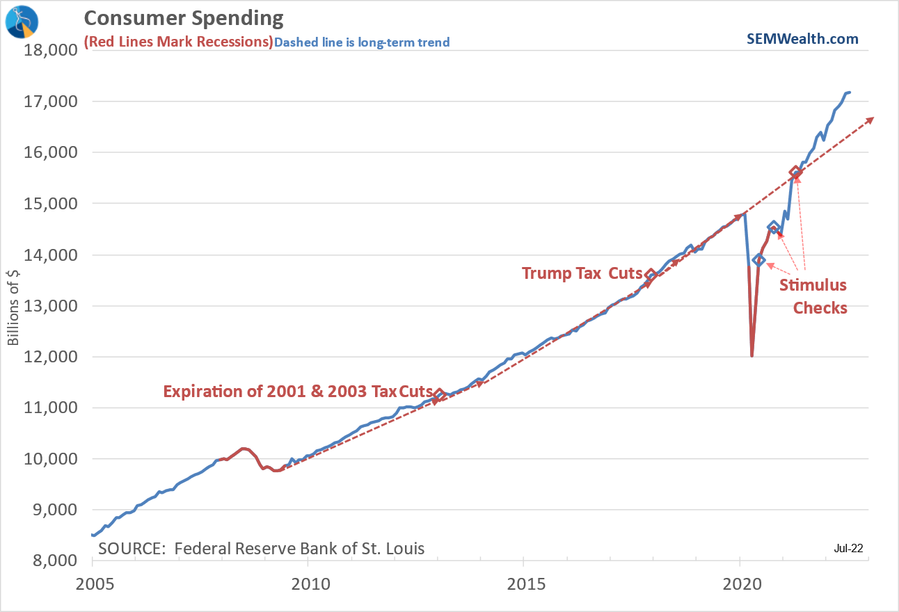 Consumer spending had returned to it's pre-COVID trends just before the last round of stimulus checks hit. That was supposed to be the goal, yet the Fed kept their foot on the gas pedal and now acts shocked that we have so much inflation.