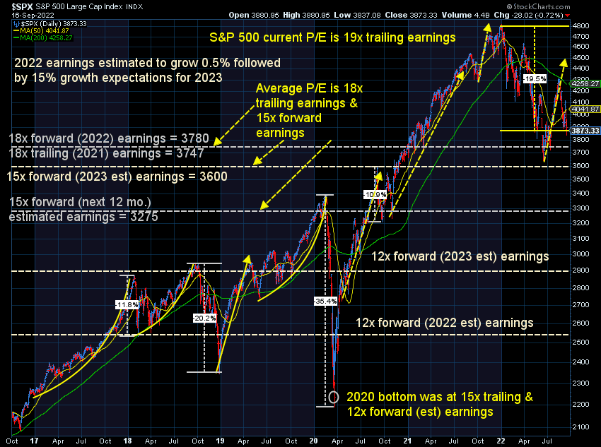 I continue to say I won't be excited about stocks until we get down to the 3000 level for the S&P. That would put us somewhere around 12x forward earnings, which is when we've seen the best bear market bottoms historically. That's 22% lower from here and would put the total bear market loss at 37%. If that happens by next spring that would be in the range of what we should expect during a TRUE bear market.