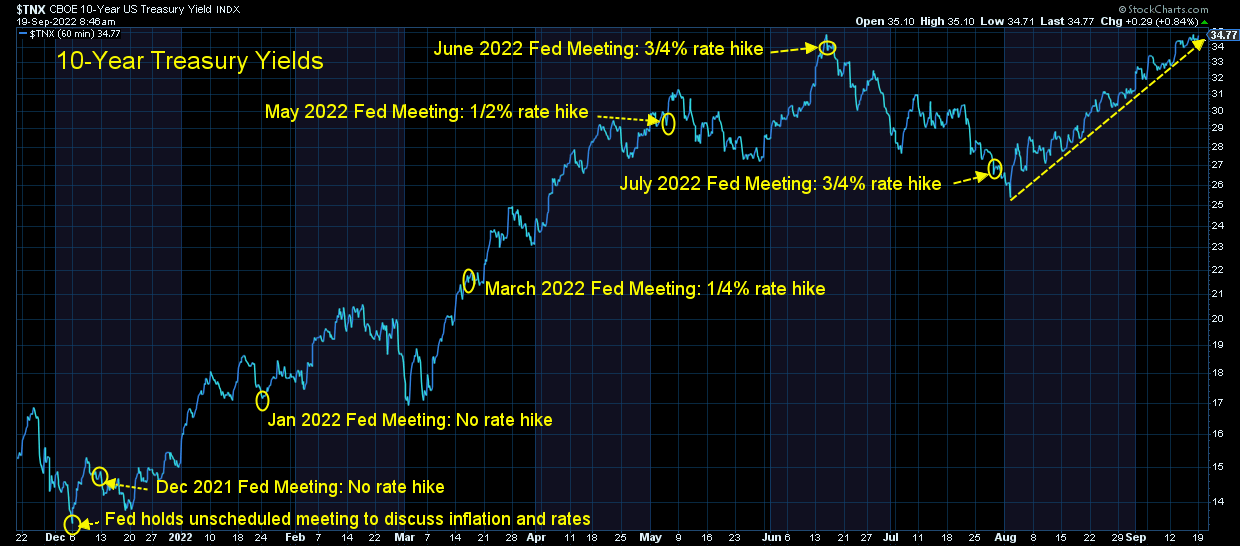Turning to bonds, we can see how little faith bond investors have in the Fed's ability to control inflation. It appeared the Fed was finally getting serious in June when they hiked rates by 0.75%, but following the July meeting their language and actions have convinced bond market participants inflation could be running hotter and longer than any of us would like.