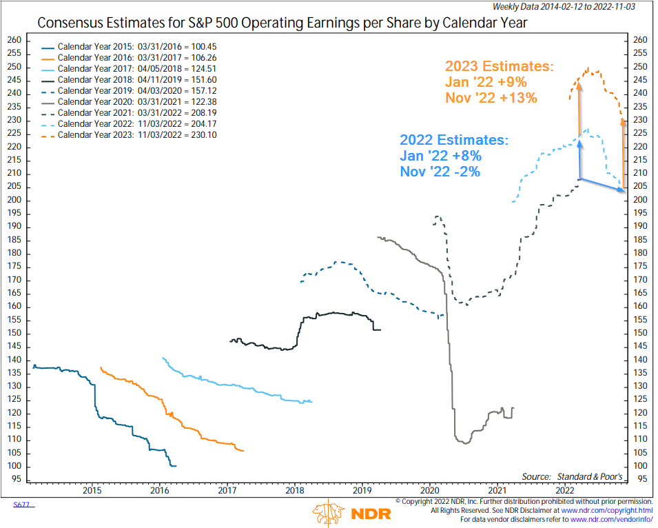 -Earnings are likely to be negative in 2022 and more importantly not grow at the currently expected 13% in 2023. Recessions always bring DECLINES in corporate earnings. This is absolutely not priced into the market. This is one of my favorite charts as it shows the trend in earnings estimates. Most of the time Wall Street has it completely wrong. What absolutely blows me away is the unwavering expectation that 2023 is going to be a great year for corporate earnings.