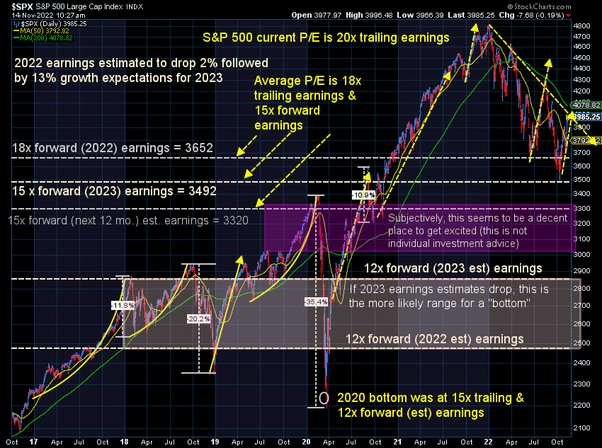 If you trust the Wall Street estimates (which I think will be much lower in reality), you cannot argue stocks are attractive from a valuation standpoint. Maybe around 3500-3600 you could make that case, but certainly not now. Based on market history, I wouldn't even start getting excited until around 3000-3300. I'd actually prefer to see stocks down to 2500-2800 before I could declare stocks "undervalued".