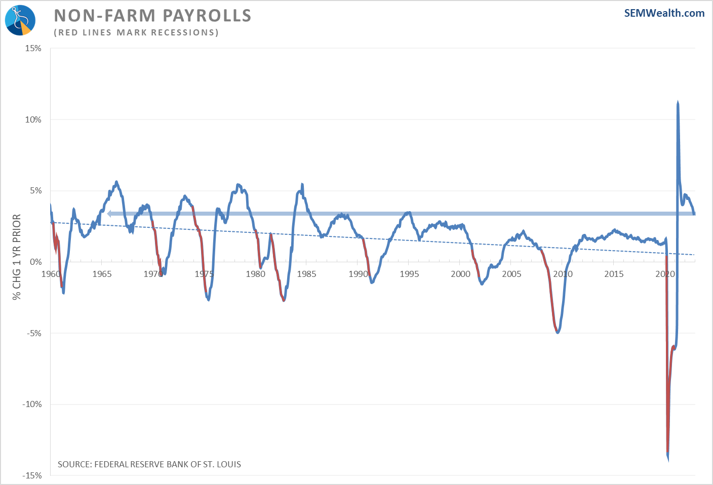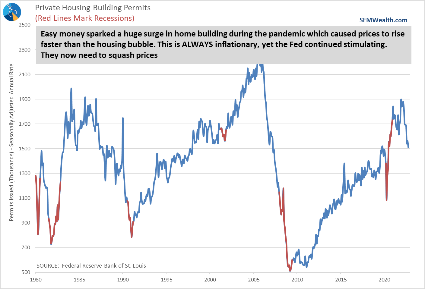 Another indicator which is technically still "neutral" in terms of economic growth contribution but rolling over is Building Permits. It's obvious the spike in permits was skewed by COVID and now with rates significantly higher the number of new houses should slow.