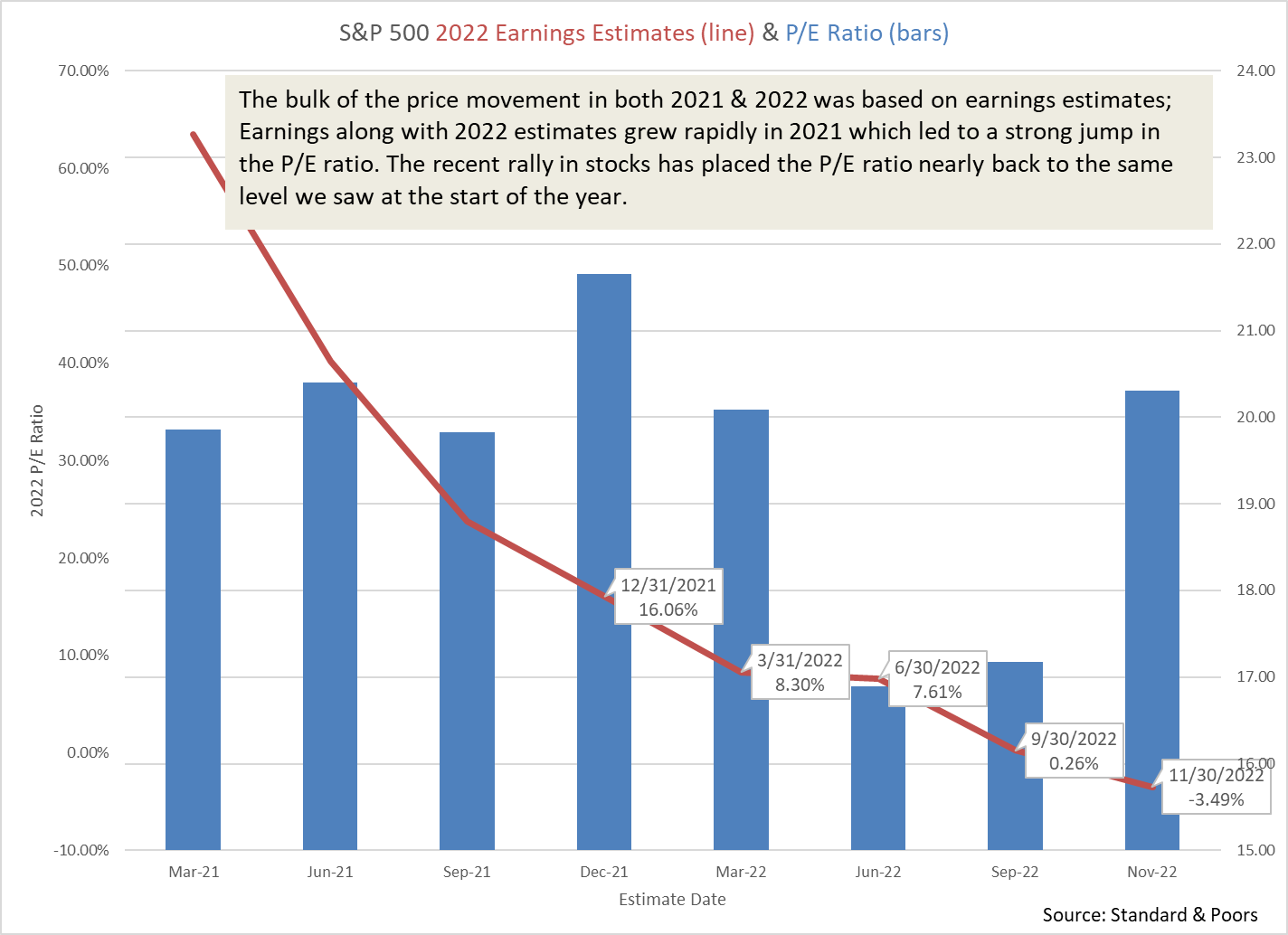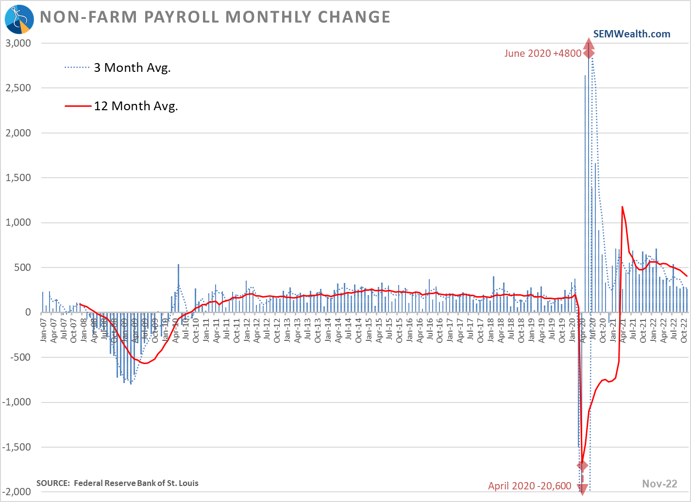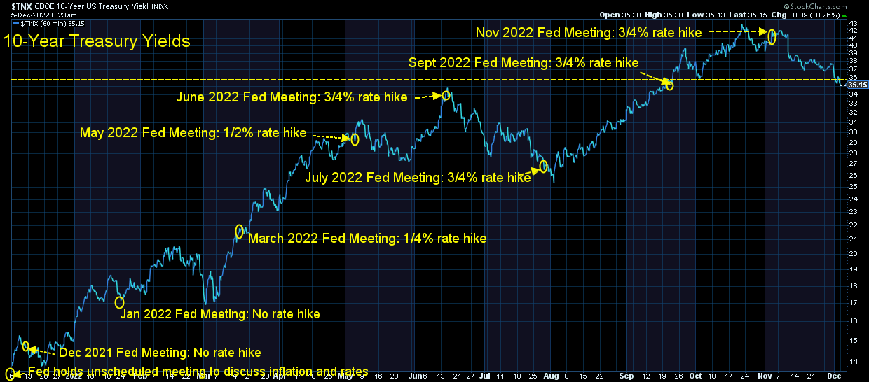 If the Fed follows through with a 0.50% hike in December that will bring the total increases to 4.25% for 2022. Think about this – a year ago short-term interest rates were 0% and long-term rates were around 1.3%. Now short-term rates will be above 4% with long-term rates around 3.7%. This is a MAJOR drag on the economy (and should cause inflation to return to 'normal' levels). In my opinion the focus shouldn't be on inflation and what it means for Fed policy but instead what this hike in borrowing costs is doing to the economy.