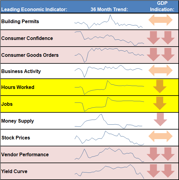 Our quantitative economic model, which was developed in 1995 and systematized in 2001 has been warning about an economic slowdown since April. This month's update shows an economy that appears to be rolling over. Since April, the one bright spot has been the labor market. Despite a headline number on Friday stating the labor market was "hotter" than expected, our data shows both the number of jobs and the hours worked index are slowing. What matters most for economic growth is whether or not the various components are better or worse than a year ago.