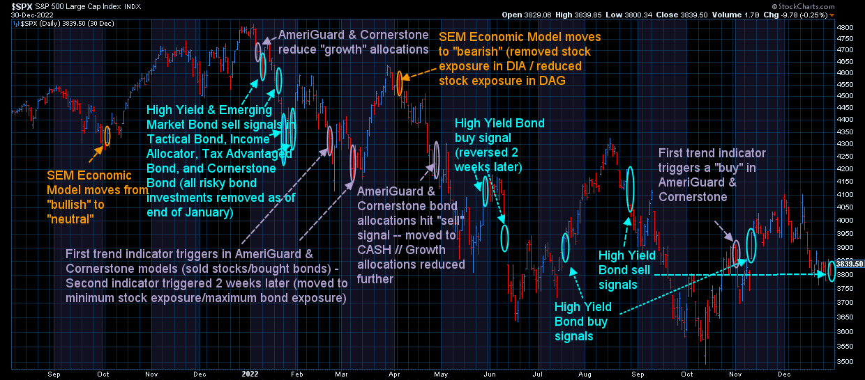 That said, all of our systems performed as expected. This is saying something given how unprecedented the year was for stock and bond returns. We've NEVER had an environment like we saw in 2022, yet our systems held up. We will always take the full force of the losses at the start of a bear market. By mid-March we had put the defense fully on the field.