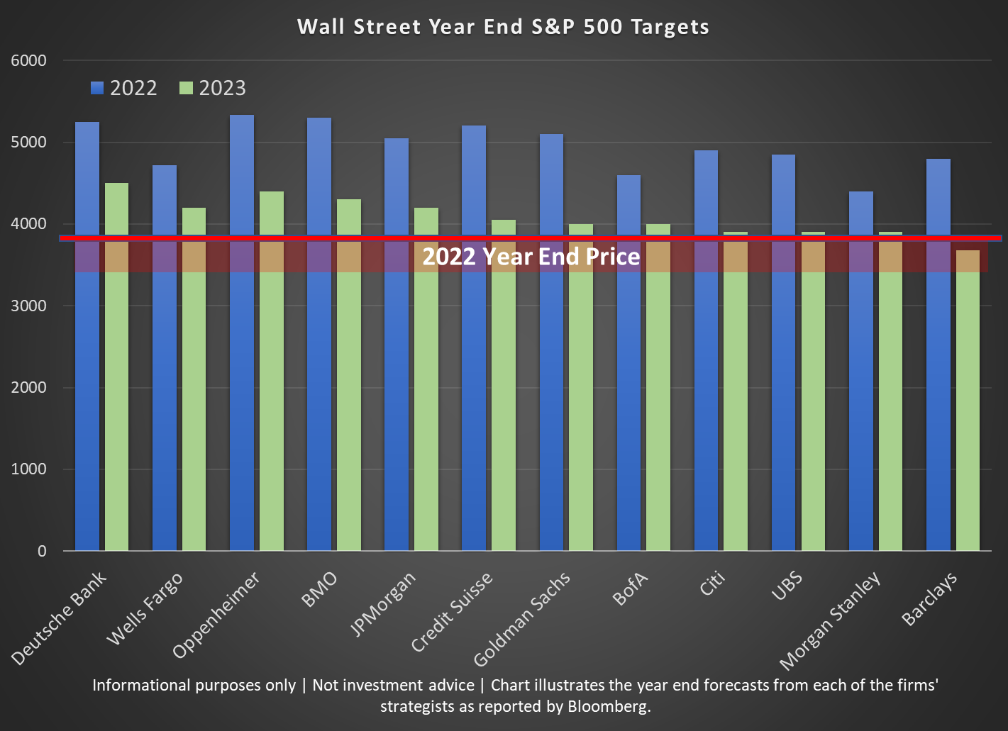 This year we see more of the same. I've compiled this chart to illustrate both how wrong the overly bullish firms were in 2022 and how those firms remain steadfast in their belief stocks are going to post above average returns this year.