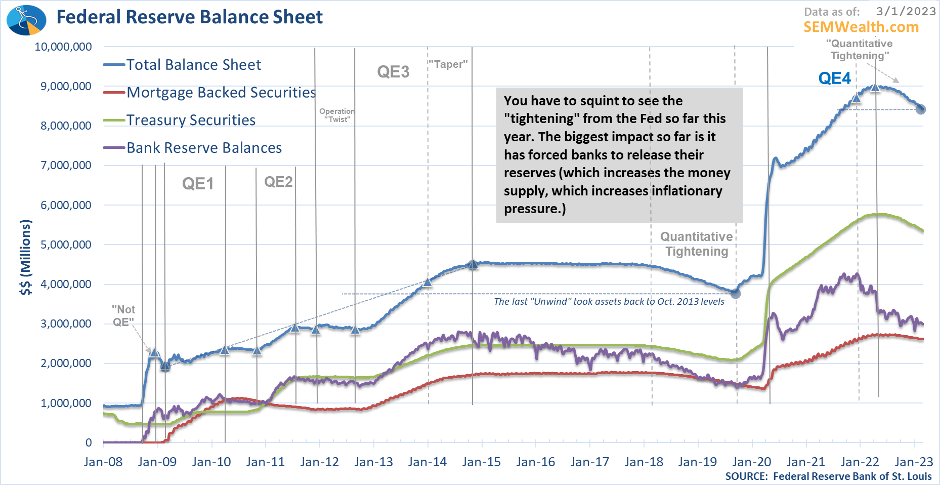 Now, the Fed is not only not buying, but they are also gradually selling their positions (in an attempt to reign in inflationary pressures. This could be playing a bigger role than any of us realize. This is what their balance sheet looks like. Note the drop in the blue and green lines (the overall balance sheet and Treasury positions respectively).