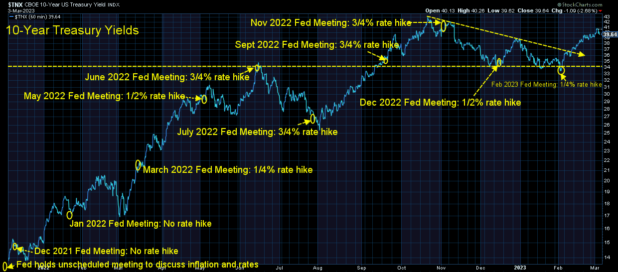 Combine this with the expectation that the Fed will save the stock market and we have seen instances where slight changes in a message in one speech cause a big rally (or sell-off) in the market. This was the case late last week when despite a parade of Fed members the past two weeks reminding anyone who would listen their primary concern is not raising rates so much the economy falls into a recession, but instead that inflation has become to embedded in the economy. We've seen interest rates move significantly higher as the bond market shares the concern of the Fed's members. The longer inflation sticks around at higher levels, the more difficult it will be to control.