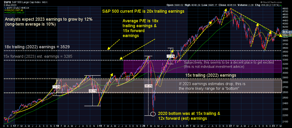 2022 started with the P/E ratio at 21. The current P/E is 20 and analysts are not only assuming no recession, but ABOVE AVERAGE earnings growth this year. The average P/E is 18 (based on these rosy estimates). Stocks are not a bargain today. Stay patient and stick to your plan!