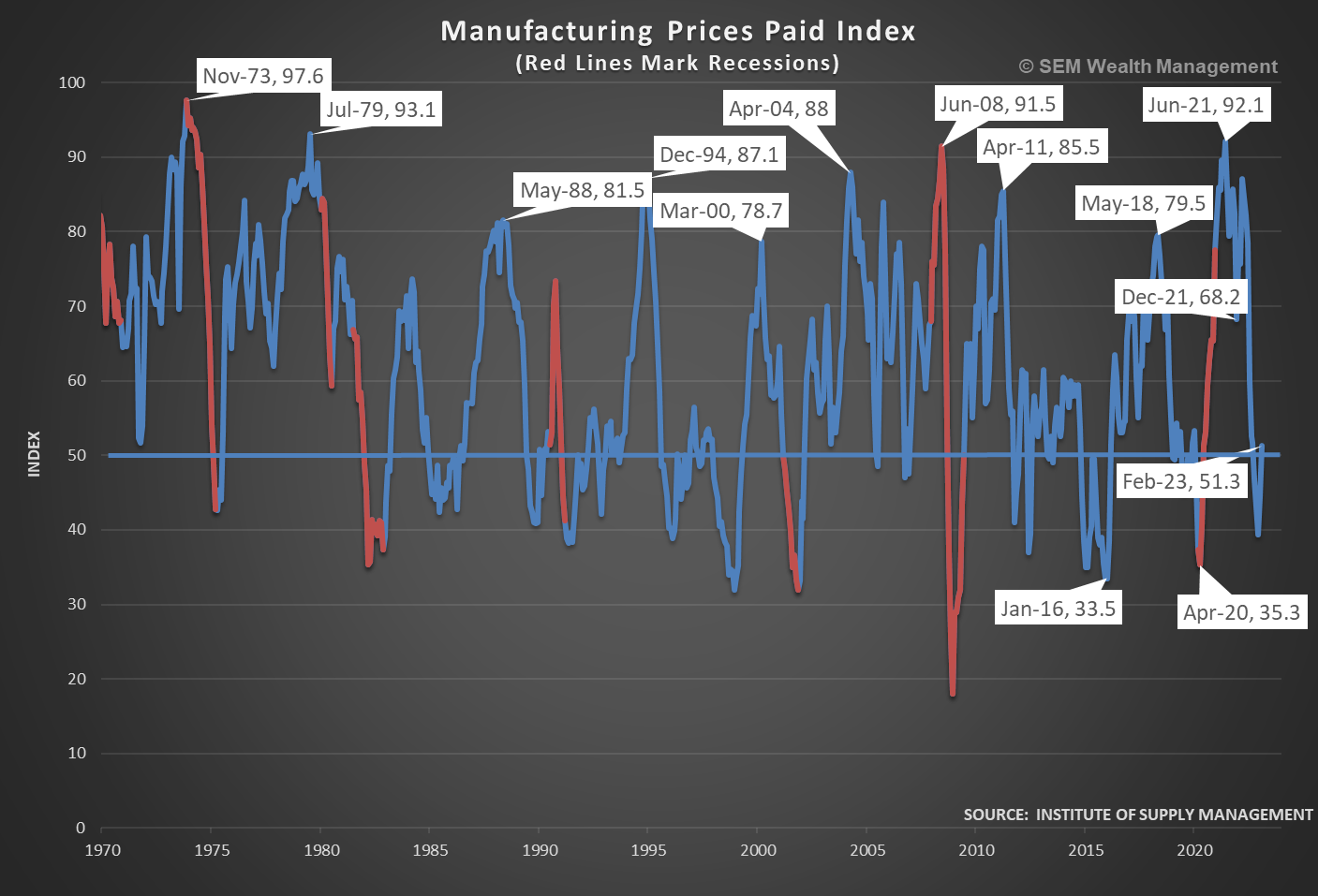 The economic data last week was solid if you believe the economy will continue to expand. The problem is if the economy remains strong inflation is going to be higher for longer, which could lead to more aggressive Fed actions. We will have a full economic update next week following the payrolls report to be released on Friday. One piece of worrisome news for those who believe the Fed is almost done did show up in the ISM Manufacturing report. The prices paid component has moved back into "expansionary" territory meaning the deflationary trend inside the supply chain appears to be coming to an end.