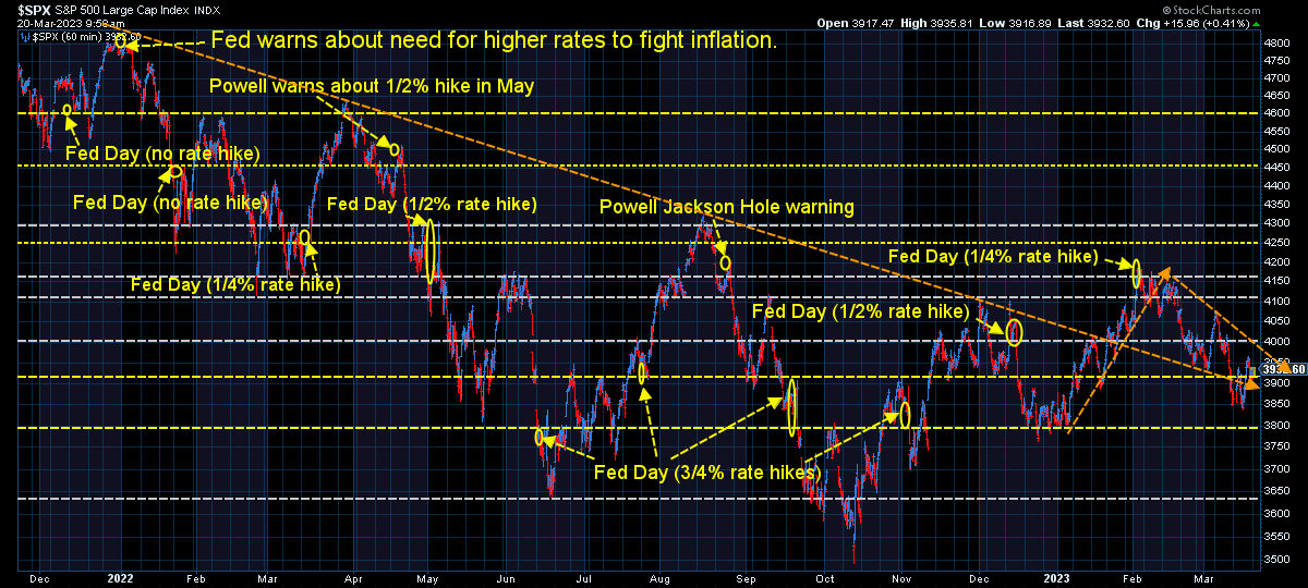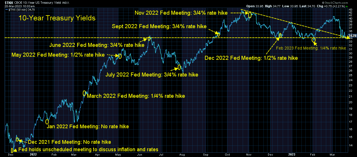 Everyone is blaming the Fed: I spent most of the week agitated because it seems every single person is blaming the Fed for this crisis. I also (partially) blame the Fed, but not for the same reason everyone else is. Everyone is pointing to the "rapid" rate hikes as the culprit for this crisis. What they fail to acknowledge is the fact the FREE MARKET sets LONG-TERM interest rates and this is where the losses occurred. Had the banks not been greedy and invested their deposits in short-term instruments, we wouldn't have this problem. The issue is the Fed took the $5 Trillion Congress dumped into the economy across 3 stimulus bills and essentially doubled it with their QE programs. They kept their foot on the gas until last March. That's the problem. There was too much money in the system and whenever there is too much money stupid things start happening. Businesses that had no business getting funding got funded. People who had no business getting a loan got loans. Investment managers who had no business managing money saw significant growth. Bankers who had no business being bankers received huge bonuses. When the Fed pulled away the stimulus, all those stupid things were exposed.