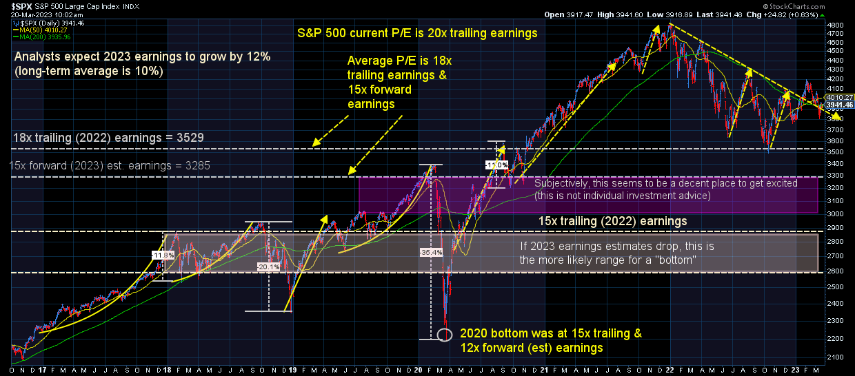 What does the Fed want to happen? We saw a big drop in the "Fed Fund Futures" contract, which essentially illustrates where the market believes interest rates will go. In 3 days we saw the "terminal" (final rate of the tightening cycle) move from 5.5% down to 4.25% (which would indicate rate CUTS in the next 9 months). Here's the problem — if the banking crisis spreads too much further and longer, it will both be deflationary (less money freely flowing) and likely cause a quick recession. In other words the Fed's "job" of knocking inflation back down to 2% would be taken care of. However, if they successfully calm the markets, we could see rampant risk-taking return which would probably keep inflation uncomfortably high and cause the Fed to have to RAISE rates even further.