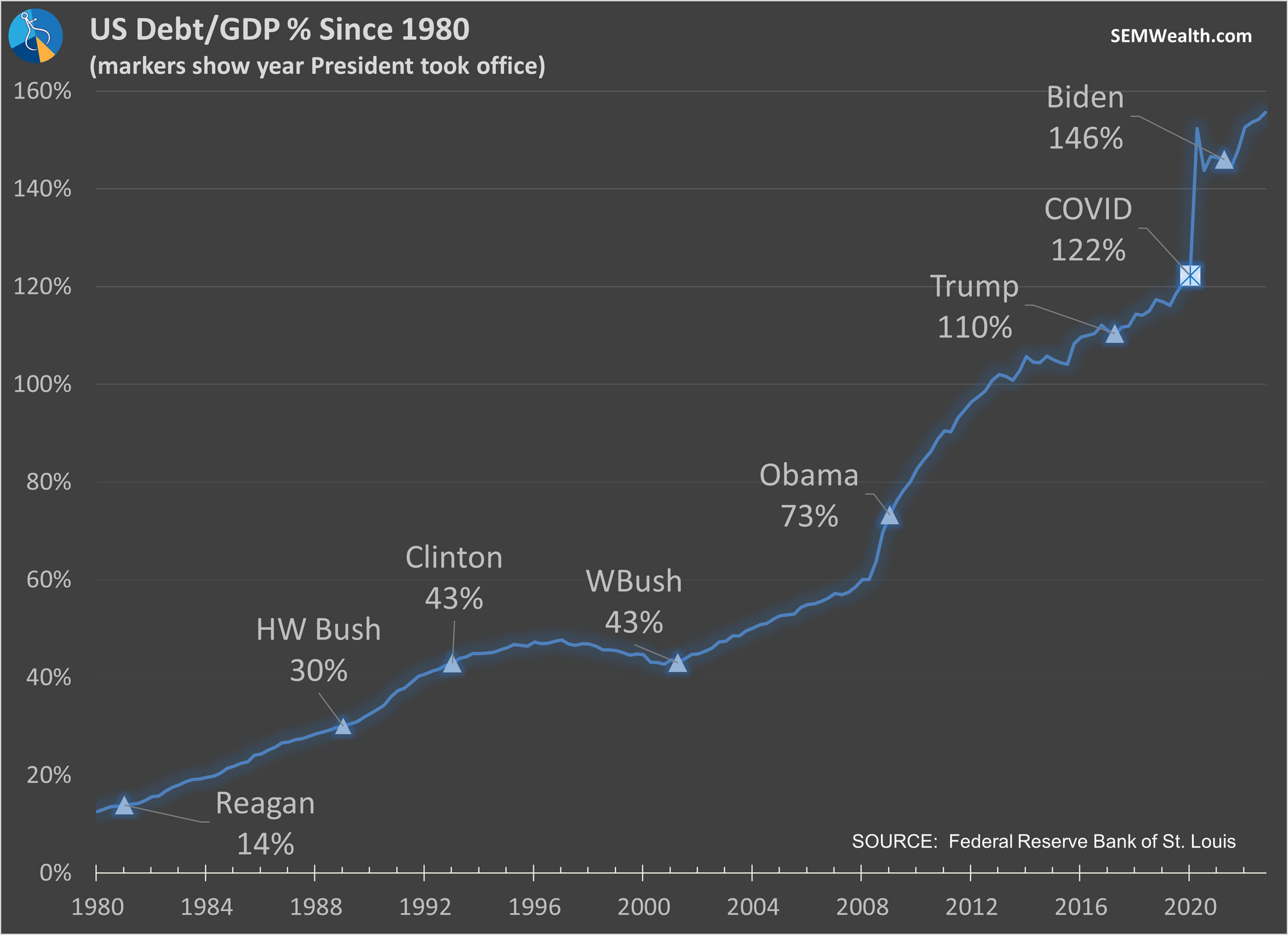 It might be easy to blame the other party, but the data doesn't support this. Trump and W Bush were just as responsible as Obama and Biden. Both sides have no problem raising the debt ceiling when their guy is in office, but suddenly take issue with it when the other guy has control.