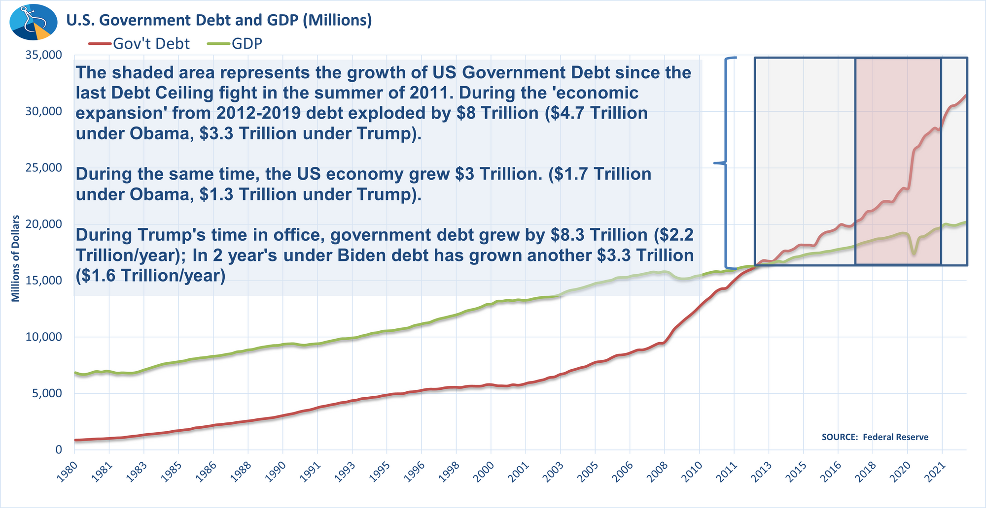 The national debt grew $8 Trillion under Trump, more debt than our country added from 1776-2000. Congress voted 3 times to raise the debt ceiling under Trump (after the Democrats own brinkmanship). Yes, Biden has added another $3.3 Trillion in 2 years, but if we continue that pace he would add $1.7 Trillion LESS debt than Trump.