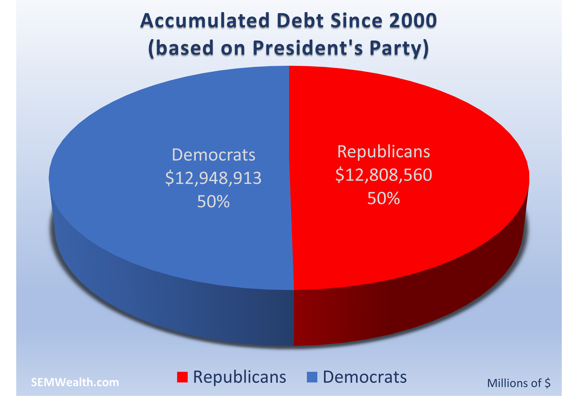 BOTH parties are EQUALLY responsible for our debt. Since 2000 we've added over $25 Trillion to the $31 Trillion total. Think about that for a second. At the turn of the century, we had just $6 Trillion of debt.