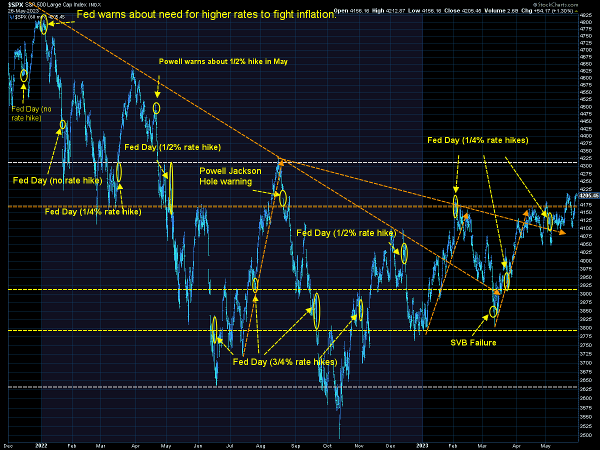 Turing to the markets, the debt ceiling was the least of anybody's concerns if you look at the stock market last week. On an hourly chart the S&P 500 is still trying to get above the February highs.