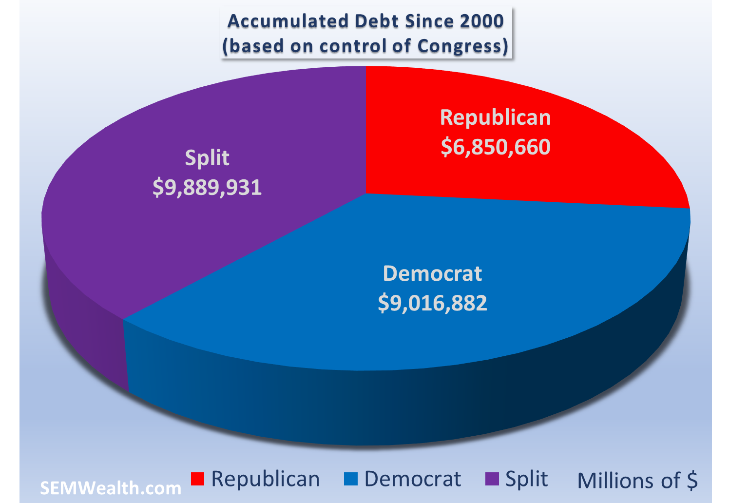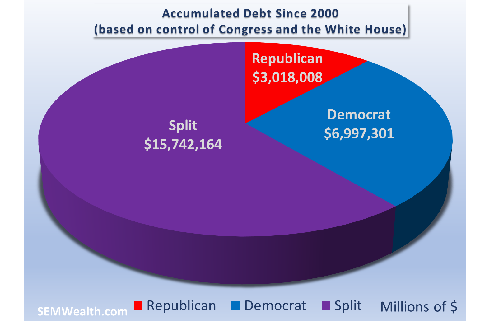 Looking at this deal you have to ask "what was the point?". I shared a few weeks back a chart showing the accumulated debt from each party based on who was in the White House. One of the commentators on TikTok asked what this would look like based on the composition of Congress. I think this is telling — we've accumulated the most debt when Congress has been split. It seems paying off both sides is expensive. The second most debt is when the Democrats control Congress. There is more fiscal constraint when Republicans have full control (although they are still accumulating debt).