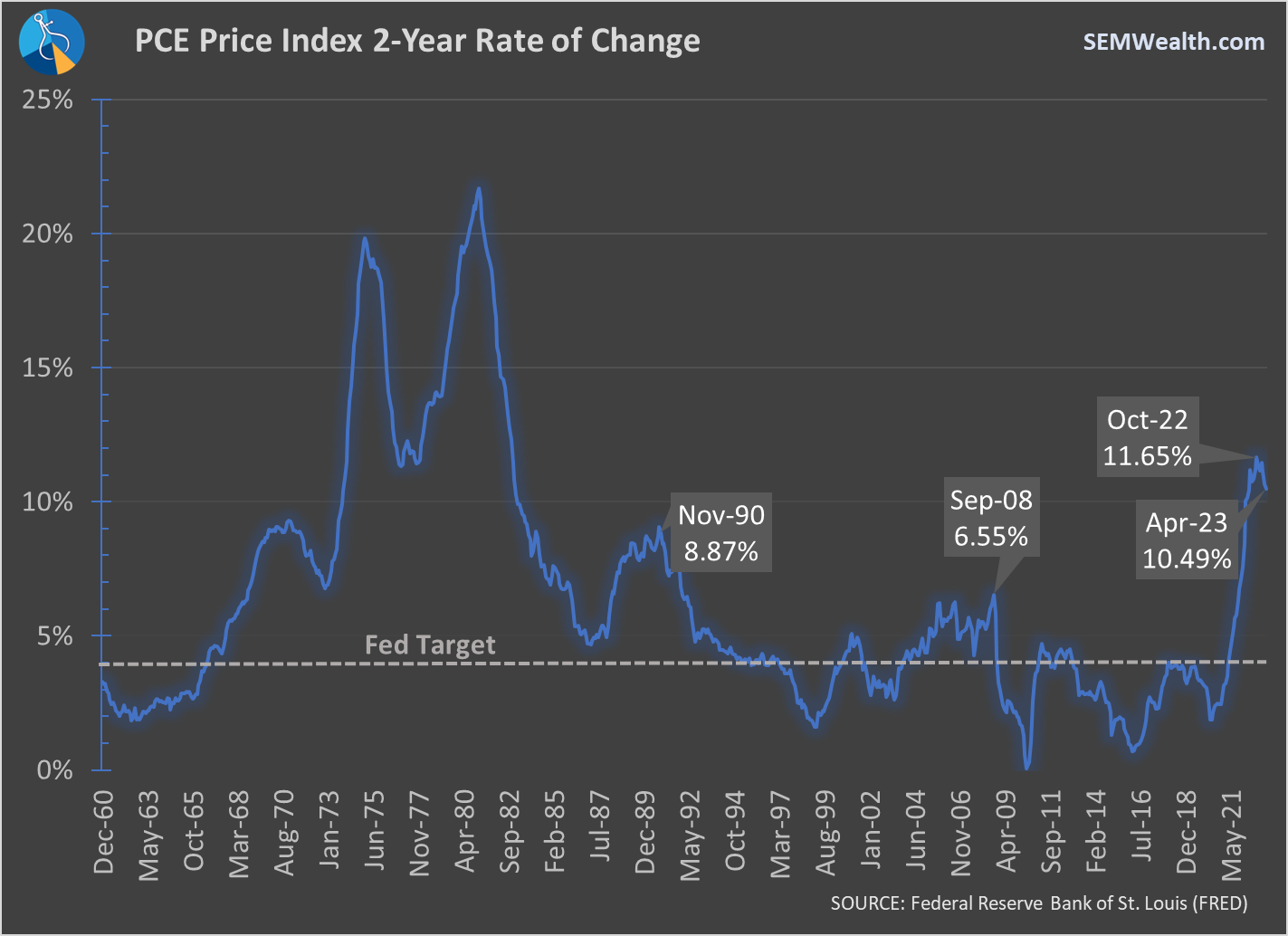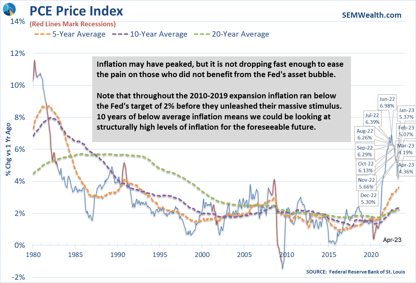 Inflation while lower, is still much higher than anything we've experienced this century. Only now has the 10 & 20 year average rate of inflation climbed above the Fed's so-called "target" of 2% annualized inflation.