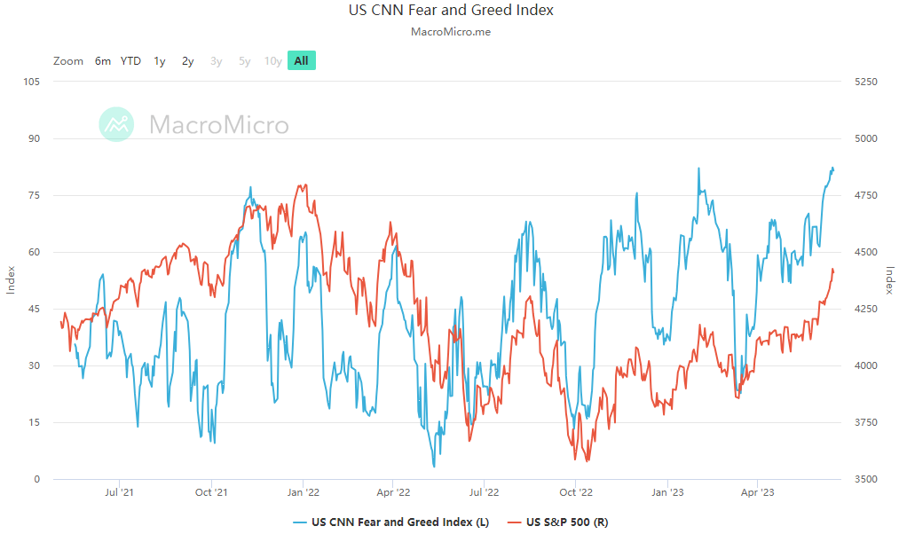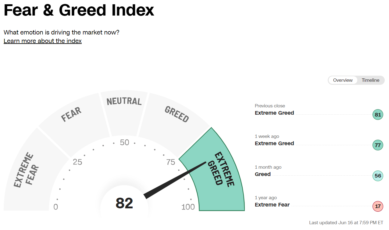 The CNN Fear-Greed Index, which measures 7 different sentiment indicators is back to "Extreme Greed" territory.