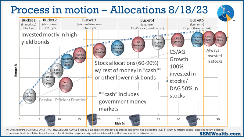 Strategic (quarterly)*: The core rotation is adjusted quarterly. On August 17 it rotated out of mid-cap growth and into small cap value. It also sold some large cap value to buy some large cap blend and growth. The large cap purchases were in actively managed funds with more diversification than the S&P 500 (banking on the market broadening out beyond the top 5-10 stocks.)