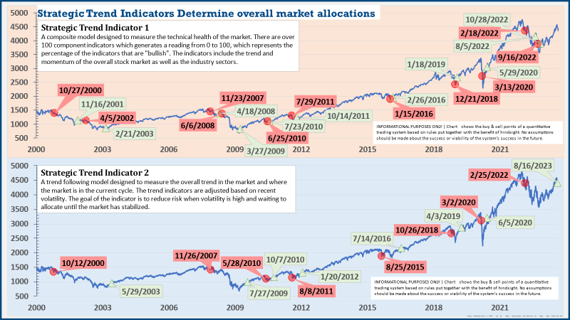 The * in quarterly is for the trend models. These models are watched daily but they trade infrequently based on readings of where each believe we are in the cycle. The second indicator triggered on August 16, brining the strategic models to a fully invested position. We are NOT locked into these for the next quarter. The 'sell-point' for this system is down around 3-4% from here.
