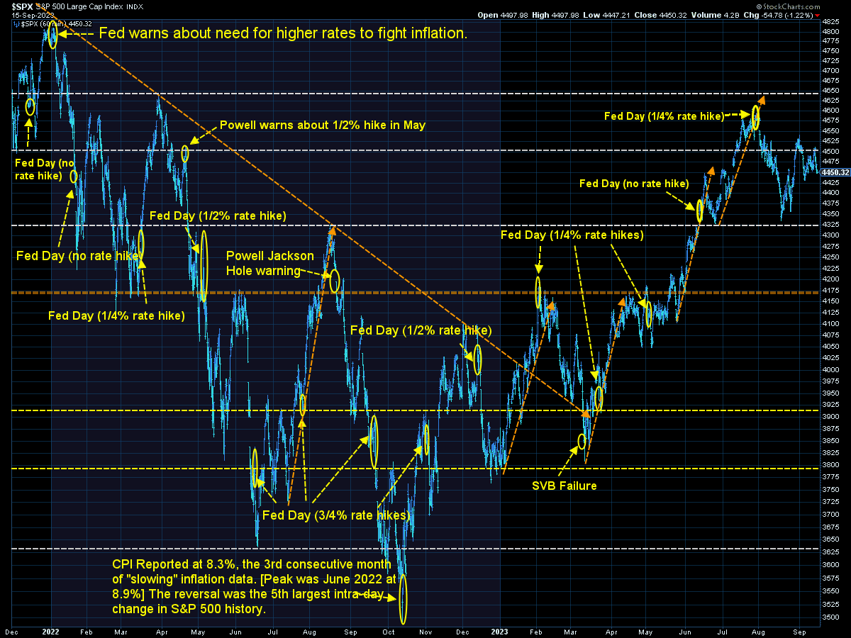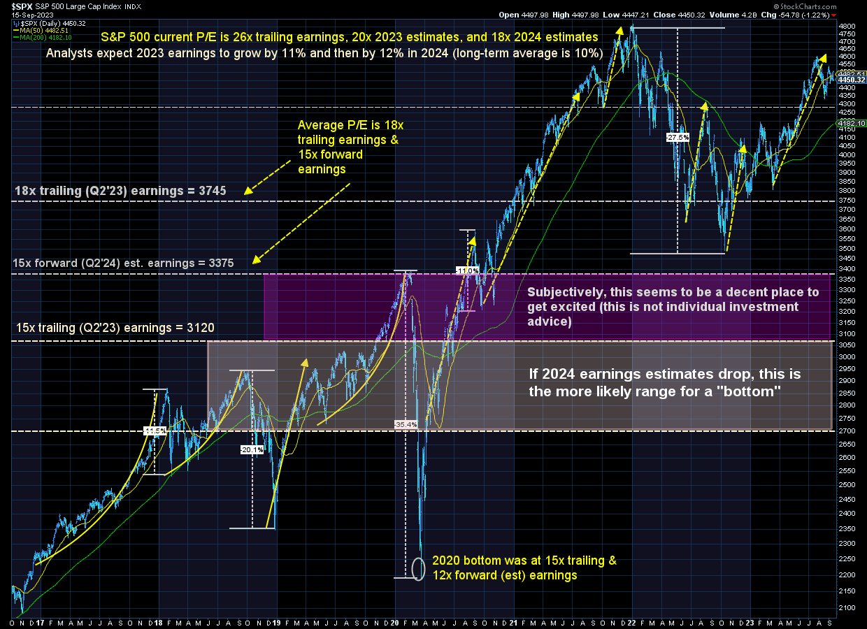 The question of the day was 'why did stocks drop so much on Friday?' The answer is pretty simple – at 4500 the S&P 500 is priced for perfection — no economic slowdown, inflation returning to 2%, AND the Fed cutting rates in 2024. The problem is it is difficult to foresee an environment when the economy is strong and the Fed decides, 'you know what, we should cut interest rates.' When you look at the short-term chart of the S&P we can see a new range appears to be forming between 4325 on the low end and 4500 on the high end.