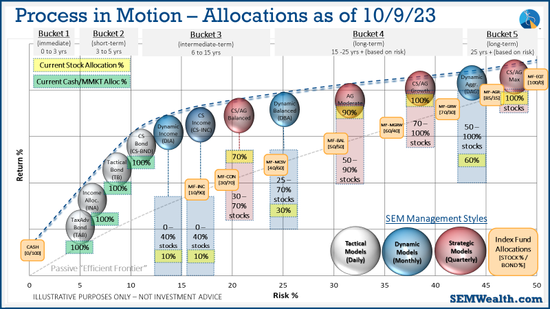 We've updated our "bubble" chart illustrating the wide range of models available at SEM. The purpose is to explain where the various models fall in terms of risk & potential returns, but also to show the 3 distinct management styles (plus a 4th 'static' stock/bond index set for those who only want consistent market exposure).