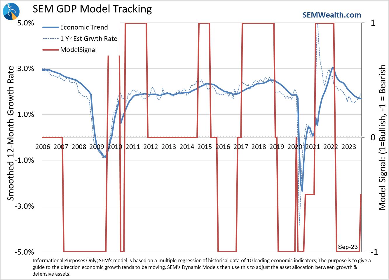 Now, with the September economic model data completed, we are seeing our economic model move slightly more optimistic on the economic growth trend. This means dipping our toes in the beaten up dividend stocks on the Dynamic Income side as well as small cap stocks on the Dynamic Aggressive side. The model is still leaning bearish, but less so then it has been since April 2022.