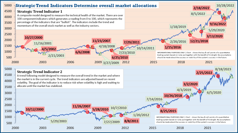 One thing I appreciate about our three-pronged, data driven approach at SEM is the ability to "zig" when everyone else "zags". The last two plus months we've seen the S&P 500 fall by 7% as those concerns spread. In mid-August the second "trend" model in our 'strategic' AmeriGuard & Cornerstone models moved to a 'buy' signal as the market strength broadened out (namely the average stock was not going down as much as the mega-cap growth stocks that drove the market higher in 2023). Note BOTH of these trend indicators are within a few percentage points of going back to a SELL.