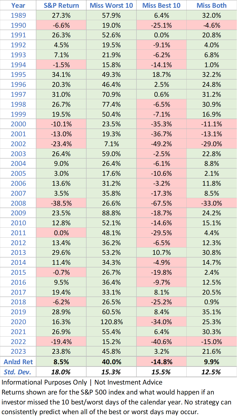 I've seen this title in many formats the last 25+ years of my career. It is most certainly true that if you missed just those 10 days every year you would have horrible performance and miss out on all the good things about the stock market. However, it completely masks the volatility and risks of investing. Some people simply cannot afford or stomach the wild swings of the stock market while others simply do not need to put themselves through that kind of stress.