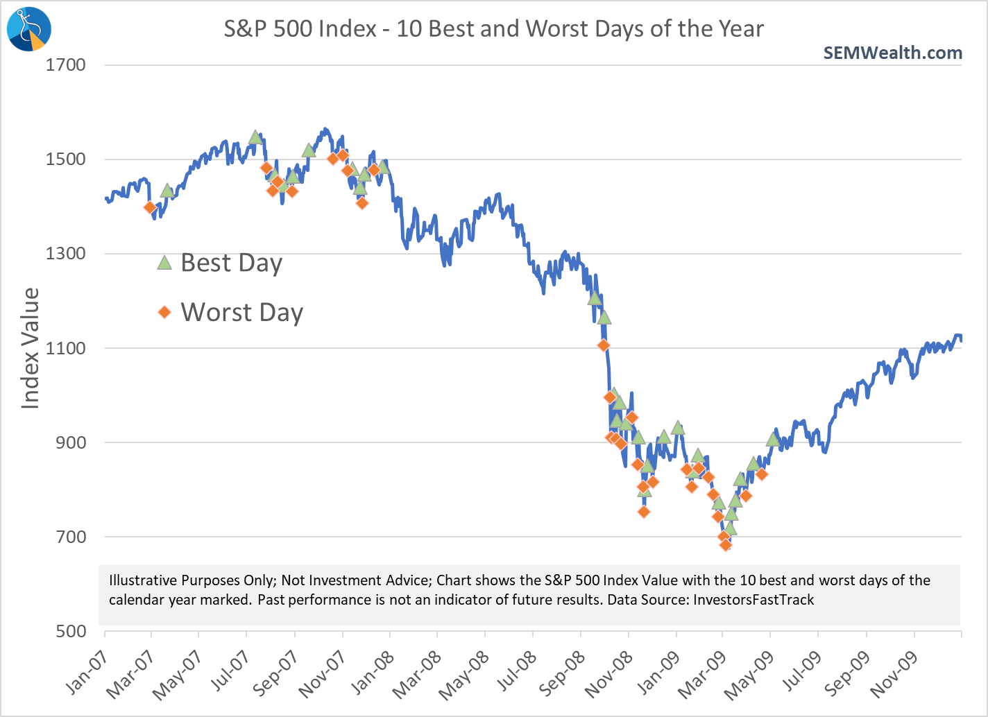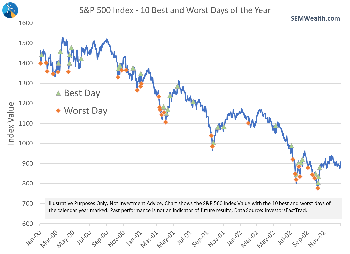 It is obviously very bad to miss the 10 best days of every year. However, the returns are spectacular if you missed the 10 WORST days of the year. I typically turn it around and say, "what if you missed BOTH the 10 BEST days and the 10 WORST days of the year?" While that is not possible to do in reality, what we do find is the BEST days often occur following severe declines in the market. Take a look at some select 3 year periods. Notice how the best and worst days tend to be clumped together.