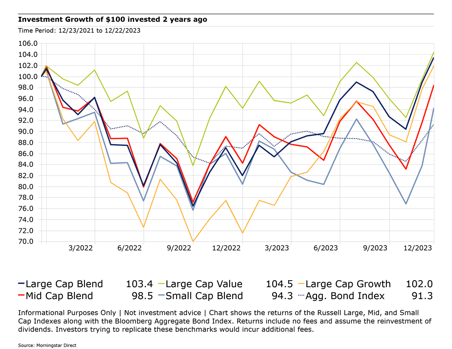 Rather than posting the usual market charts this week, I thought I would include a look back at the past 2 years for some of the market benchmarks. Despite the spectacular returns for the mega-cap growth stocks in 2023, Large Cap Value stocks are the best performers when we go back 2 years.