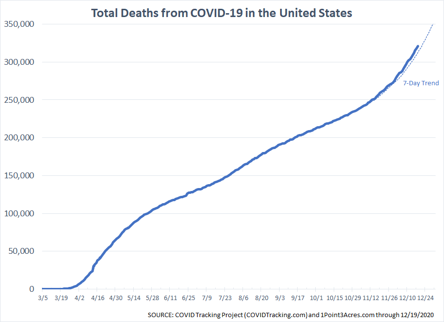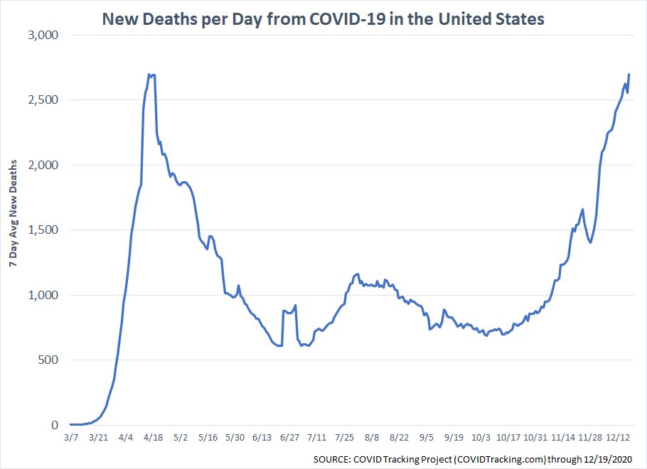 - At the rate we're going, this week the 7-day average of COVID-19 deaths will likely pass the peak from the spring.