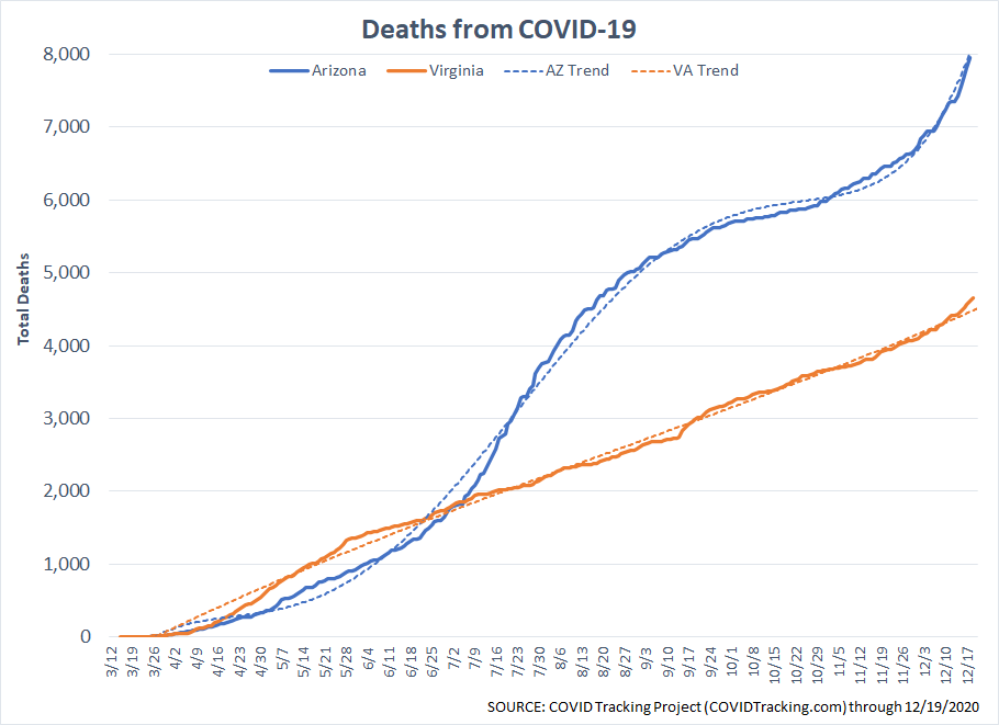 - Early in the pandemic I commented on the difference in how different regions have reacted to the virus. Areas (like Arizona) have essentially no restrictions and one of the highest Rt rates in the country while others (like Virginia) have fairly heavy restrictions with one of the lower Rt rates in the country. (Rt is the rate the virus is spreading. See Rt.live) Looking at Arizona's COVID deaths versus Virginia's you can see the different waves. Keep in mind, Arizona has over 2 million less people than Virginia and far fewer heavily populated regions.